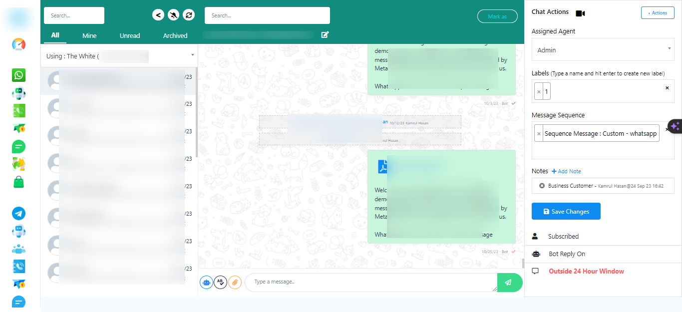 You can assign a message to your team members from the `assigned agent` section. Select an agent for the conversation and add labels and sequences if needed. Then, save it.